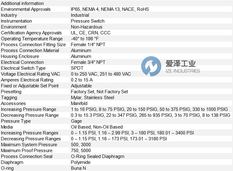 604G系列是一种通用型全铝压力表开关。它的结构包括一个集成的端子盒和开关设计,并且设定点调整非常方便。该开关易于安装在隔板上,并具有UL认证,以及NEMA 4和IP65等级防护。它利用Dual Snap碟形弹簧技术,具有高抗振动和抗冲击性。适用于非危险环境的应用包括: