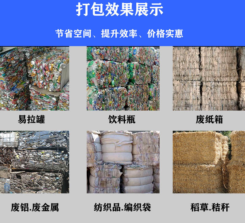 液压打包机适用于秸杆、牧草、废纸打包、棉花打包、服装打包、秸杆打包、塑料打包、羊毛打包、可回收垃圾打包,亦可应用于棉、羊毛、废纸箱、废纸板、纱线、烟叶、塑料、布匹、编织袋、针织绒、麻、麻袋、毛条、毛球、茧、蚕丝、啤酒花、废塑料袋等一切轻泡、松散物料等松软类物料进行压缩打包,包型紧凑,整齐美观,可大幅度降低运输成本,是棉产区、纺织企业、服装厂、废旧物质回收站和其他各种轻工业企业的生产工具。