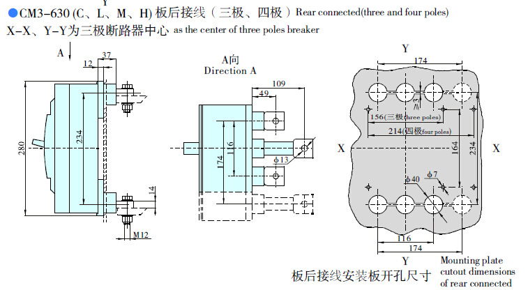 ●断路器极限短路分断能力级别为C、L、M型可倒进线连接M型使用于AC690V电压时及H型不可倒进线即1、3、5接电源线2、4、6接负载线。