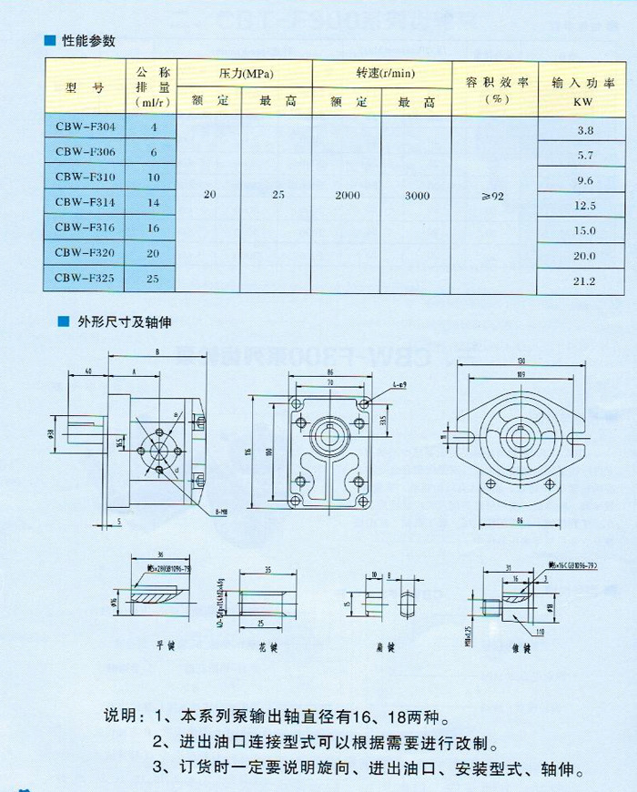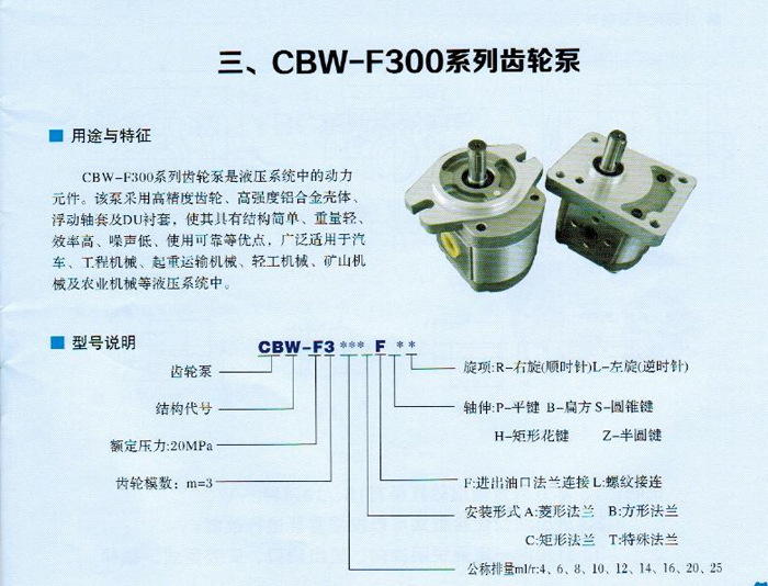 CBW-F系列齿轮泵是液压系统中的动力元件。改泵采用高精度齿轮,高强度铝合金壳体,浮动轴套,使其具有结构简单,重量轻,高效率,低噪音,使用可靠等优点,广泛使用于汽车,工厂机械,起重运输机械,矿山机械,轻工机械,农用机械以及工业自动化等液压系统中。