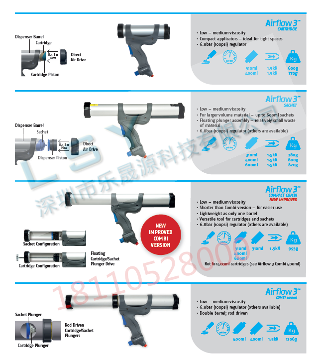 •     Airflow 3采用全新的设计,旨在使产品更容易使用,更有效率,主要特点是新设计的手柄更符合人体工程学,枪身更短,在狭小空间内使用成为可能,胶枪重量更轻(例如:310ml筒装型0.66KG),比I型和II型(0.73KG)减轻10%以上重量,重新设计的调压器提供了更高的性能,更低的故障率和维护方便,调压器和消音器集成于手柄,工作更安静,噪音更低,全封闭式气路无外露气管,更加可靠,这是英国COX公司推出的第三代产品。