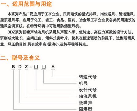 BDZ系列防爆低噪声节能轴流风机,采取从声源入手,低转速,高压力系数的设计方法,研制成大弘长、空间扭曲,倾斜式宽叶片,使其在低速驱动的前提下,达到所需风量、风压的目的,具有效率高、振动小、运转平稳等特点。