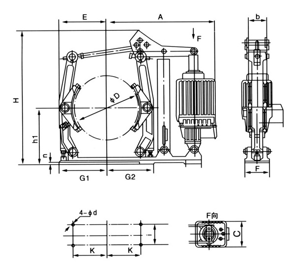 型号 匹配推动器 制动力矩(牛顿.米) 退距 A b C D d E F G1 G2 H h1 i K M n 重量(千克)