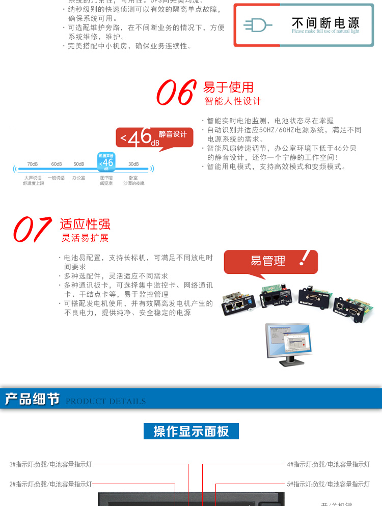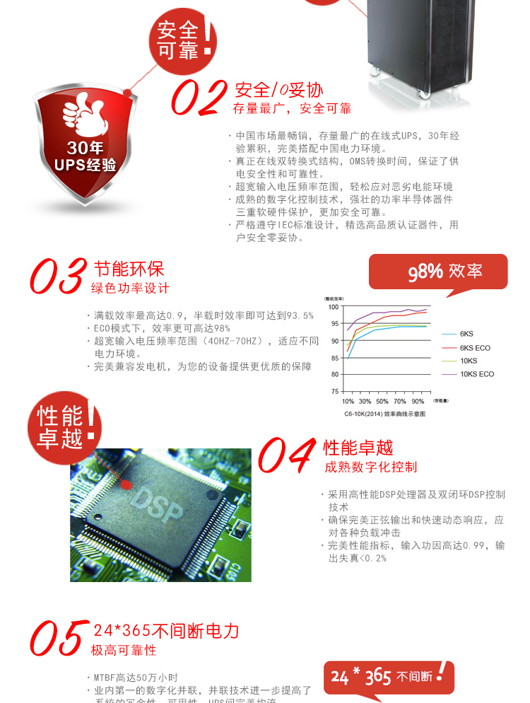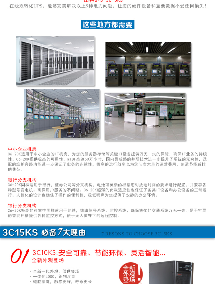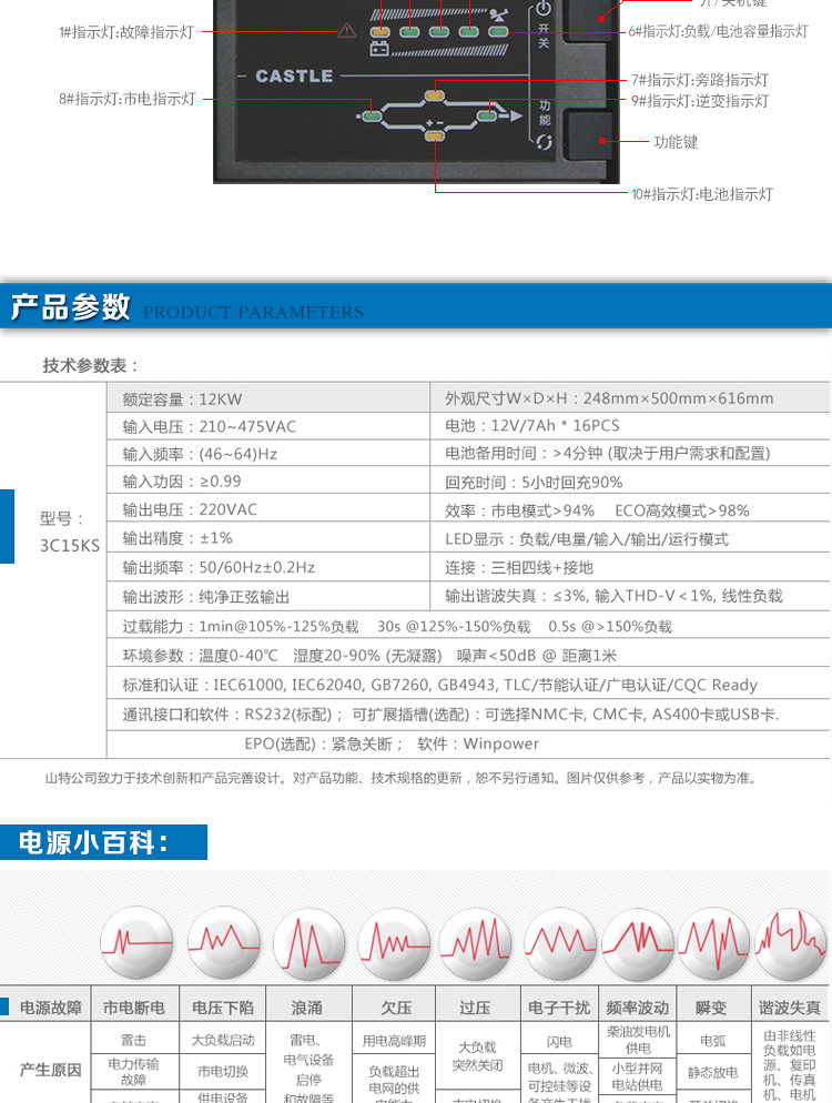 城堡系列C6K(S)~3C20KS采用双转换纯在线式架构,是最能有效解决所有电源问题的架构设计,对电网出现:断电、市电电压过高或过低、电压瞬间跌落或是减幅震荡、高压脉冲、电压波动、浪涌电压、谐波失真、杂波干扰、频率波动等状况都可以提供良好的解决方案,为用户负载提供安全可靠的电源保障。在线式,山特3C20KS,直流电压192VDC,外接12V蓄电池16只