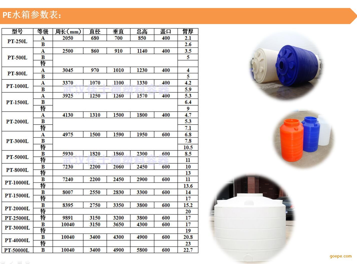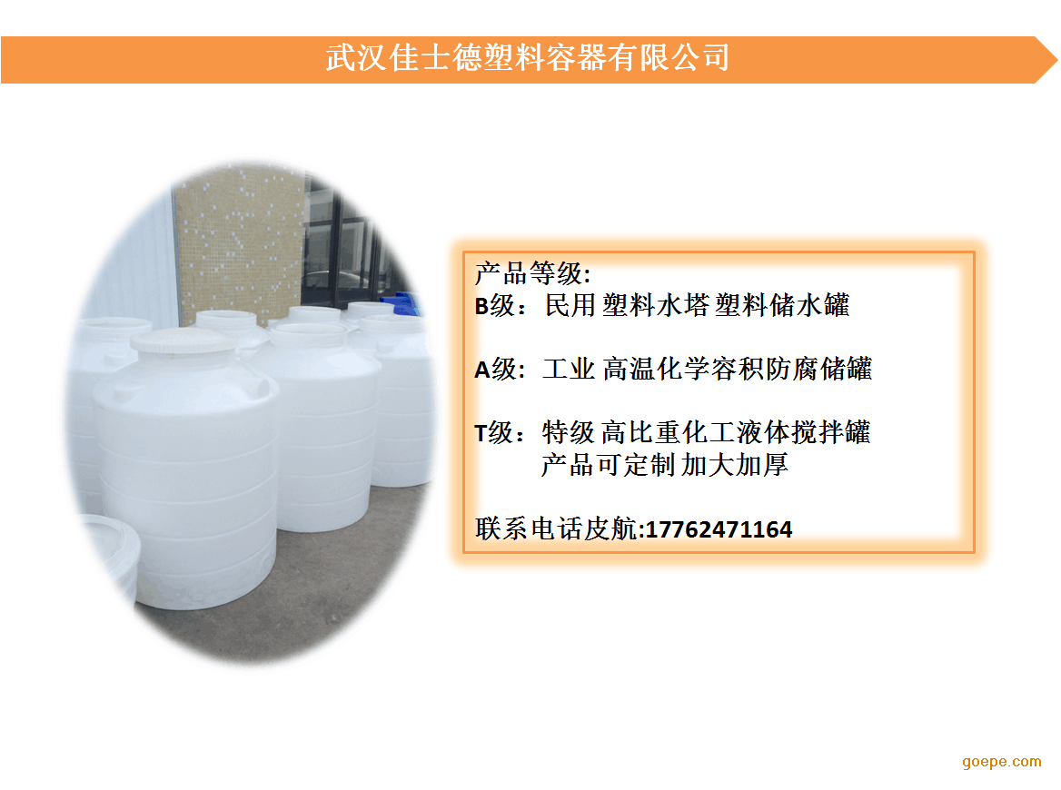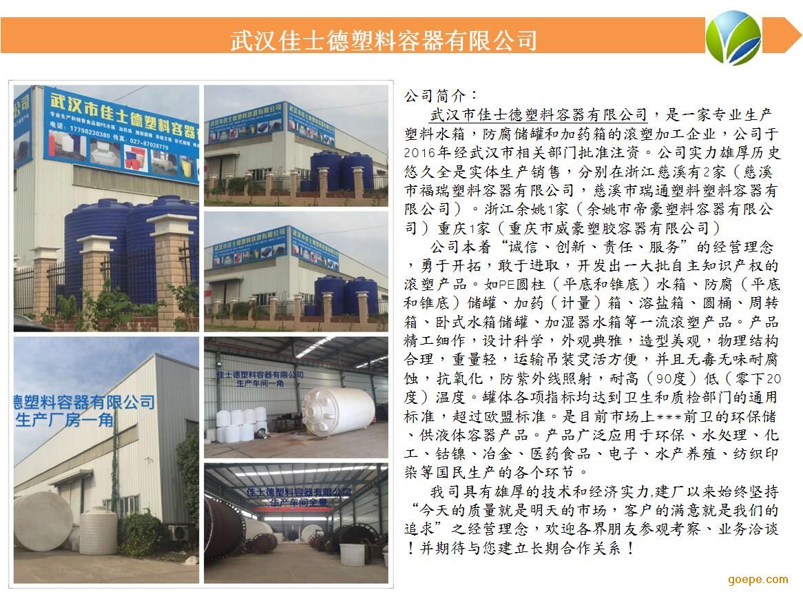 武汉8吨塑料水箱 佳士德塑业 武汉佳士德塑料容器有限公司主要致力于滚塑制品和注塑制品,采用国外成熟的ROTATION(旋转成型)一次完整成型技术,专业生产PE水箱(0.2吨-30吨)、塑料储罐(200L-30000L)、耐酸碱桶、加药箱(50L-2000L)、腌制桶(50L-3500L),水产方箱(50L-1500L)、塑料渔船(2.5米、3.2米、4.1米、6米)等滚塑产品。公司拥有一批经验丰富,多年从事塑料制品加工研究,设计,制造和试验的工程技术人员和管理人员,能够满足各行业对塑业制品的需要,武汉5吨塑料水箱广泛使用于机械、仪表、五金、电子、物流、仓储、水产、化工、医药、环卫、生物、染料、冶金、稀土、电镀、电力、纺织、印染、环保、酿造、食品等行业。佳士德塑业立足武汉,面向全国。产品销往武汉、荆州、襄樊、十堰、宜昌、黄冈、孝感、鄂州、咸宁等湖北省全境,并远销至江西、湖南、河南、安徽、陕西等全国各地。