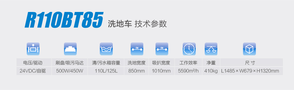 R110BT85 驾驶式洗地车,一款拥有“极高清洗效率”的世界领先的高品质洗地车。通过实践,其效率相当两台大型手推式洗地机。极小的回旋直径,在狭窄的区域内也有最佳机动性。轻松通过90厘米宽度的门道。