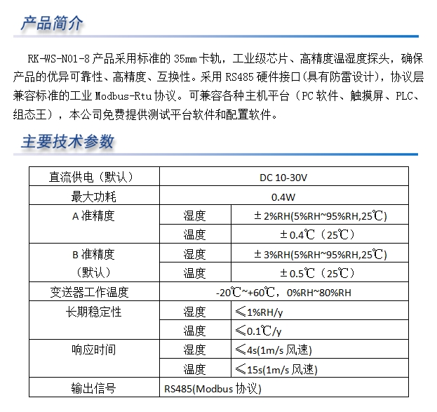 RS-WS-N01-8采用美国进口工业级芯片、高精度温湿度探头,确保产品的优异可靠性、高精度、互换性。具有准确,稳定,使用寿命长等特点。
