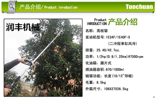 使用范围:适用于苹果、柑橘、板栗、桃子、梨子等果园及城市绿化的枝叶修剪、截枝,操作简单,工作效率高。油耗: 0.6L/H