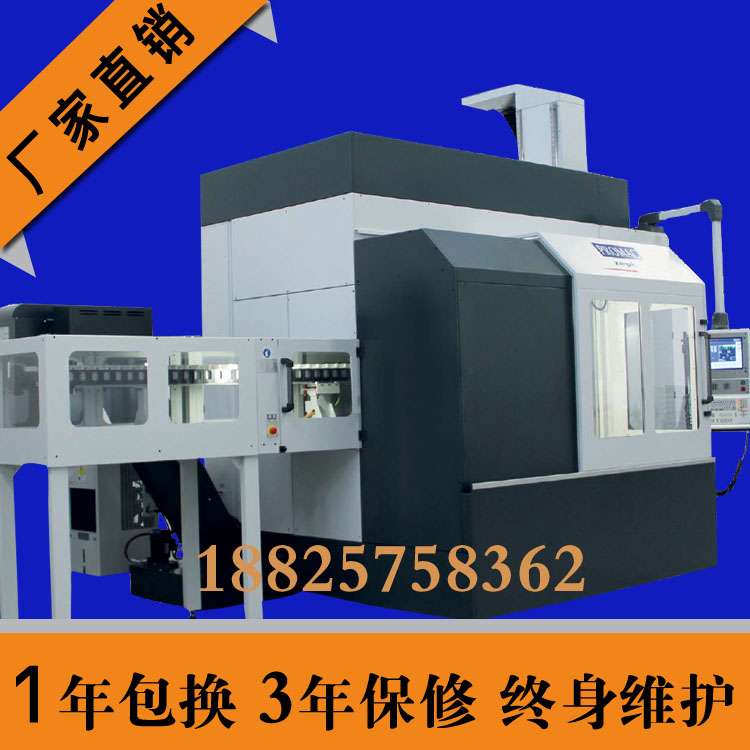 所谓五轴加工机这里是指在一台机床上至少有五个坐标轴(三个直线坐标和两个旋转坐标),而且可在计算机数控(CNC)系统的控制下同时协调运动进行加工。这样的五轴联动数控加工与一般的三轴联动数控加工相比,主要有以下优点:中心加工机即加工中心机床,也叫CNC机床,简称加工中心(英文名是。加工中心机通常由控制系统、伺服系统、检测系统、机械传动系统及其他辅助系统组成的使用于加工复杂形状工件的高效率自动化机床。五轴联动加工中心也叫五轴加工中心,是一种科技含量高、精密度高专门用于加工复杂曲面的加工中心,这种加工中心系统对一个国家的航空、航天、军事、科研、精密器械、高精医疗设备等等行业有着举足轻重的影响力。 目前,五轴联动数控加工中心系统是解决叶轮、叶片、船用螺旋桨、重型发电机转子、汽轮机转子、大型柴油机曲轴等等加工的唯一手段。 五轴联动加工有高效率、高精度的特点,工件一次装夹就可完成五面体的加工。若配以五轴联动加工的高档数控系统,还可以对复杂的空间曲面进行高精度加工,更能够适应像汽车零部件、飞机结构件等现代模具的加工。立式五轴加工中心的回转轴有两种方式,一种是工作台回转轴,设置在床身上的工作台可以环绕X轴回转,定义为A轴,A轴一般工作范围+30度至-120度。工作台的中间还设有一个回转台,的位置上环绕Z轴回转,定义为C轴,C轴都是360度回转。这样通过A轴与C轴的组合,固定在工作台上的工件除了底面之外,五轴联动加工其余的五个面都可以由立式主轴进行加工。A轴和C轴最小分度值一般为0.001度,这样又可以把工件细分成任意角度,加工出倾斜面、倾斜孔等。A轴和C轴如与XYZ三直线轴实现联动,就可加工出复杂的空间曲面,当然这需要高档的数控系统、伺服系统以及软件的支持。