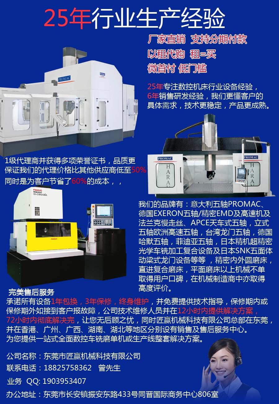 完美售后服务:我们承诺所有设备1年包换,3年保修,终身维护, 并免费提供技术指导,保修期内或保修期外如 接到客户报故障,公司技术维修人员并在12小时内 提供解决方案,72小时内彻底解决完,让您无后顾之忧, 同时匠赢机械科技有限公司总部在东莞,并在香港、广州、广西、 湖南、湖北等地区分别设有销售及售后服务中心。为您提供一站式 全面数控车铣磨单机或生产线整套解决方案。