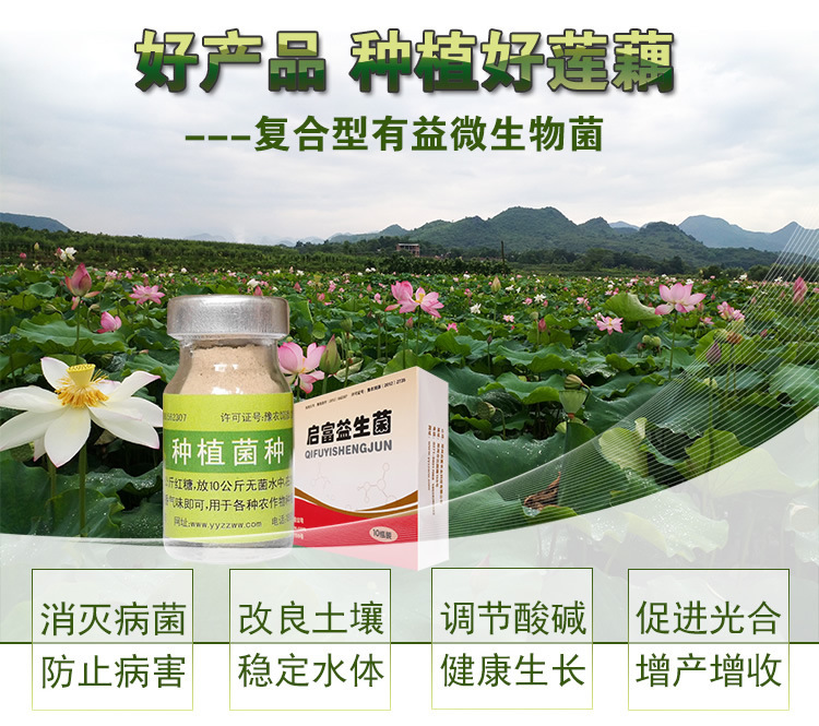 由于莲藕生长环境特殊,周围会滋生大量的细菌,所以,莲藕的常见病害大部分是有真菌引起的,施用种植EM菌种后,益生菌占领莲藕生长环境中的主导地位,会快速消灭有害病菌,有效防治病害发生。同时,豫启富种植菌种可分解土壤中的大分子元素,转换成利于莲藕吸收的营养成分,达到很好的效果