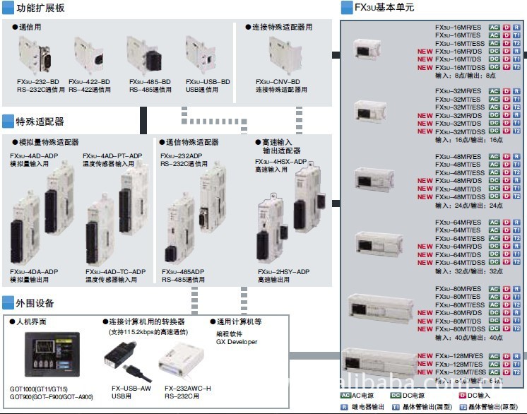 新增了高速输入输出适配器,模拟量输入输出适配器和温度输入适配器,这些适配器不占用系统点数,使用方便,在FX3U 的左侧*多可以连接10 台特殊适配器。其中通过使用高速输入适配器可以实现*多8 路、*高200kHz 的高速计数。通过使用高速输出适配器可以实现*多4 轴、*高200kHz 的定位控制,继电器输出型的基本单元上也可以通过连接该适配器进行定位控制。
