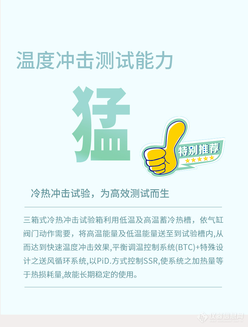 结构设计:冷热冲击试验箱通常分为三箱式和两箱式两种类型。三箱式试验箱包括高温区、低温区和测试区,通过特别的断热结构实现快速温度切换,待测物在测试过程中静止,避免振动对样品的影响。两箱式试验箱则通过提篮移动实现高低温切换,减少热负荷并缩短温度恢复时间。