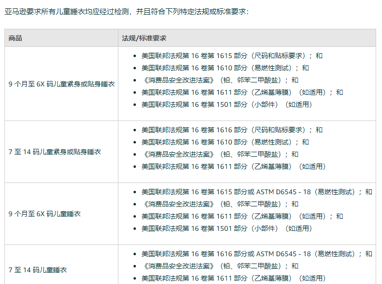 亚马逊要求所有儿童睡衣均应经过检测,并且符合下列特定法规或标准要求: